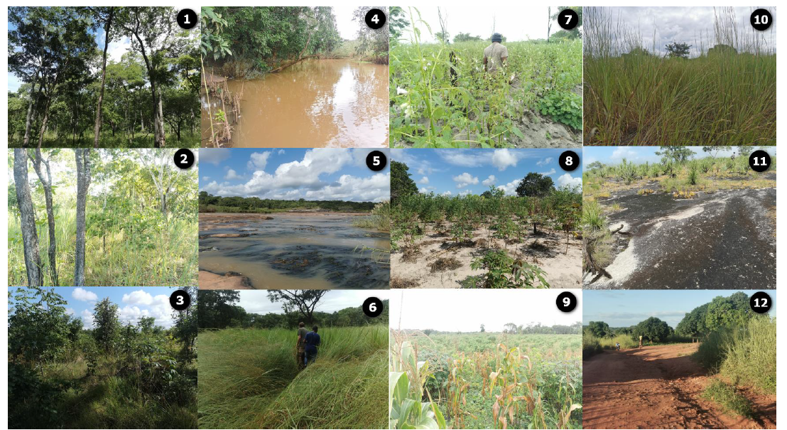 Figure 2 : Illustration des classes d’occupation du sol observées sur le terrain. 1-Forêts de Miombo ; 2-Forêts dégradées / secondaires ; 3-Jachères ; 4-Zone marécageuse ; 5-Rivière (limite du parc) avec des affleurements rocheux sur les rives ; 6-Dambo au milieu de la forêt ; 7-Culture de sésame ; 8-Culture de manioc ; 9-Zone de culture au milieu du parc ; 10-Savane herbeuse (Grassland), zone de culture abandonnée ; 11-Affleurement rocheux ; 12-Sol nu, route secondaire vers Namurrua