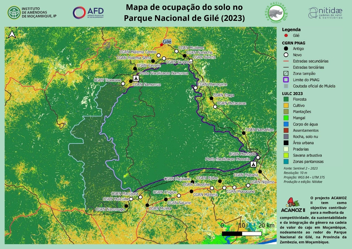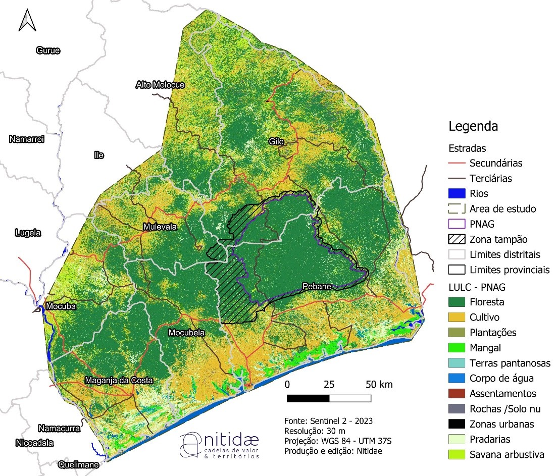 Etant donné que les activités du projet ACAMOZ 2 sont concentrées dans la zone tampon du Parc et dans les zones de production intensive de noix de cajou (Districts de Gilé et de Pebane), l’inclusion des districts de Maganja da Costa, Mulevala, Alto Molocué et Mocuba dans l'analyse cartographique de l'utilisation des terres vise à fournir des informations essentielles au PNAG et à son cogestionnaire, FFS-IGF, pour mieux comprendre la dynamique du paysage et évaluer les risques de conflits entre les populations humaines et la faune, notamment dans la zone ouest du parc, où les éléphants et les buffalos traversent fréquemment les limites du parc.